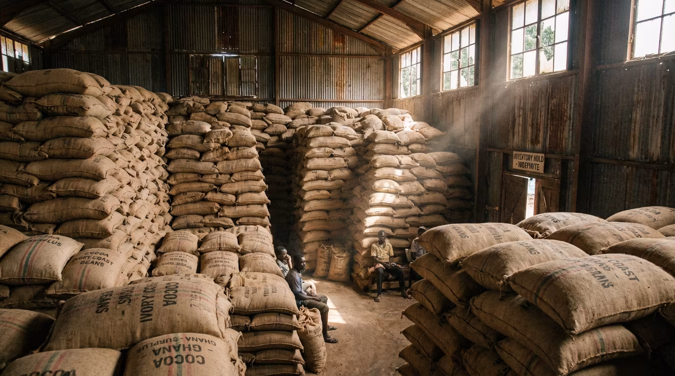 המצב בחוף השנהב מורכב אף יותר, שכן היא מהווה את העוגן המרכזי של האספקה העולמית. יחד עם גאנה, שתי המדינות הללו מחזיקות בנתח שוק דמיוני של כ-60% מתפוקת הקקאו העולמית – נתון המעניק להן, תיאורטית, כוח מונופוליסטי כמעט כמו זה של קרטל נפט. אולם, המציאות בשטח מספרת סיפור של מצוקה תזרימית. ירידת המחירים המתמשכת הותירה את הסוכנות הממשלתית בחוף השנהב, זו האמונה על רכישת הפולים מהחקלאים, במצב של חדלות פירעון מעשית. הסוכנות צברה מלאים אדירים שאינה מצליחה למכור במחירים המכסים את העלויות, ובמקביל היא מפגרת בתשלומים לחקלאים שכבר סיפקו את הסחורה. מחיר "שער החווה" (Farmgate price), שנקבע באופן מסורתי בתחילת עונת הקטיף כדי לספק ודאות למגדלים, הפך למלכודת דבש פיננסית.