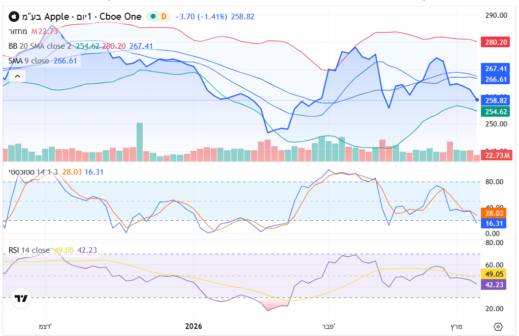 הגרף היומי של מניית אפל (AAPL) משקף את התנהגות המחיר בטווח הקצר, מסוף שנת 2025 ועד לחודש מרץ 2026, ומציג תמונה מובהקת של תיקון טכני לאחר שיא מקומי. המניה נסחרת כעת סביב רמת ה-258.82 דולר, המהווה ירידה יומית של כ-1.4%, וניכר כי היא נמצאת במהלך יורד שהחל מאמצע פברואר לאחר שפגשה התנגדות באזור ה-278 דולר (שם נשקה לרצועת בולינג'ר העליונה). הנסיגה הזו הובילה לשבירה ברורה כלפי מטה של שני ממוצעים נעים קריטיים לטווח הקצר: הממוצע הנע הפשוט ל-9 ימים (SMA 9) הממוקם כעת ב-266.61 דולר, וקו האמצע של רצועות בולינג'ר (SMA 20) הניצב ב-267.41 דולר. השבירה והשהייה מתחת לרמות אלו מאשרות את מעבר השליטה לידי המוכרים בטווח הזמן המיידי, כשהמחיר עושה כעת את דרכו לעבר הרצועה התחתונה של בולינג'ר באזור ה-254.62 דולר, אשר צפויה לשמש כתמיכה דינמית קרובה.