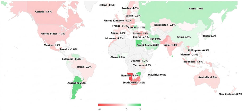 באסיה והמזרח הרחוק נרשמה תמונה מעורבת יותר המעידה על הפרדה (Decoupling) מסוימת מהלחצים במערב. בעוד שאוסטרליה (1.0%-) וניו זילנד (0.7%-) נגררו אחרי המגמה העולמית, יפן וסין הפגינו חוזק ועלו ב-0.6% ו-0.4% בהתאמה. בולטת לרעה הייתה וייטנאם עם צניחה של 2.3%, המיוחסת לחשש מהאטה בביקושים הגלובליים למוצרי צריכה המיוצרים במדינה.