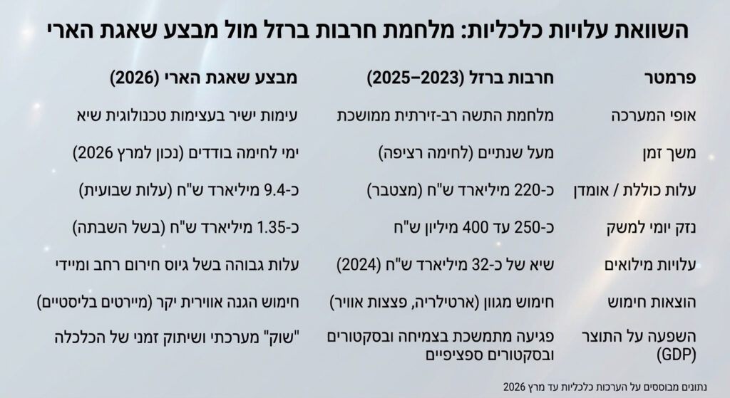 בעוד שמלחמת "חרבות ברזל" פעלה כ"מחלה כרונית" ששחקה את תקציב המדינה לאורך זמן אך אפשרה למשק לתפקד ב"שגרת חירום", מבצע "שאגת הארי" מהווה "זעזוע חריף" (Acute Shock) המאיים על עצם היציבות הפיסקלית בטווח הקצר. הנזק השבועי של "שאגת הארי" גבוה פי שלושה מזה של קודמתה, בעיקר בשל השיתוק הכמעט מלא של הכלכלה והצורך במעטפת הגנה טכנולוגית יקרה באופן קיצוני.