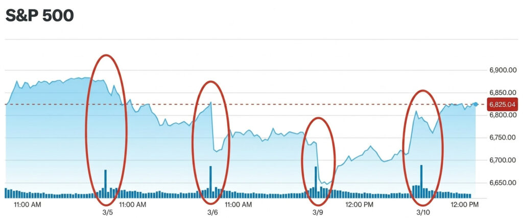 הגרף המוצג של מדד ה-S&P 500, המציג את ביצועי חמשת ימי המסחר האחרונים (בין ה-5 במרץ ל-10 במרץ 2026), חושף תמונה מרתקת של שוק הנמצא בנקודת הכרעה אסטרטגית. בעוד המדד שוהה ברמות שיא היסטוריות סביב קו ה-6,800 נקודות, בחינה מעמיקה של הקשר בין תנועת המחיר לבין מחזורי המסחר (Volume) מעלה סימני שאלה בנוגע ליציבות המגמה החיובית בטווח הקצר. ארבעת "מוקדי הרעש" המסומנים בגרף אינם מקריים; הם מייצגים את המאבק הניטש בין כוחות הביקוש להיצע בנקודות קצה.