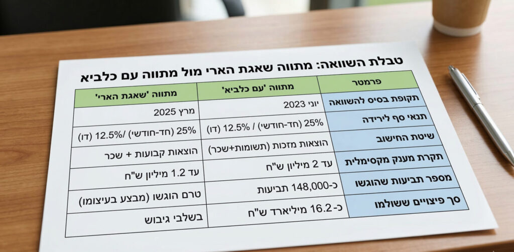 כדי להבין את היקף הסיוע הנוכחי, יש להשוות אותו למתווה "עם כלביא" שהופעל בסבב הלחימה הקודם. בעוד מתווה "עם כלביא" נשען על נתוני שנת 2023 כתקופת בסיס כדי לעקוף את עיוותי המלחמה, מתווה "שאגת הארי" בוחר בשנת 2025 כשנת הייחוס לצורך חישוב ההוצאות והמחזורים. בשני המקרים המדינה אימצה מודל של "מענקי המשכיות עסקית", אך ב"שאגת הארי" הוכנסו שיפורים ליניאריים בתקרות המענק לעסקים גדולים, המגיעות עד ל-1.2 מיליון ש"ח.